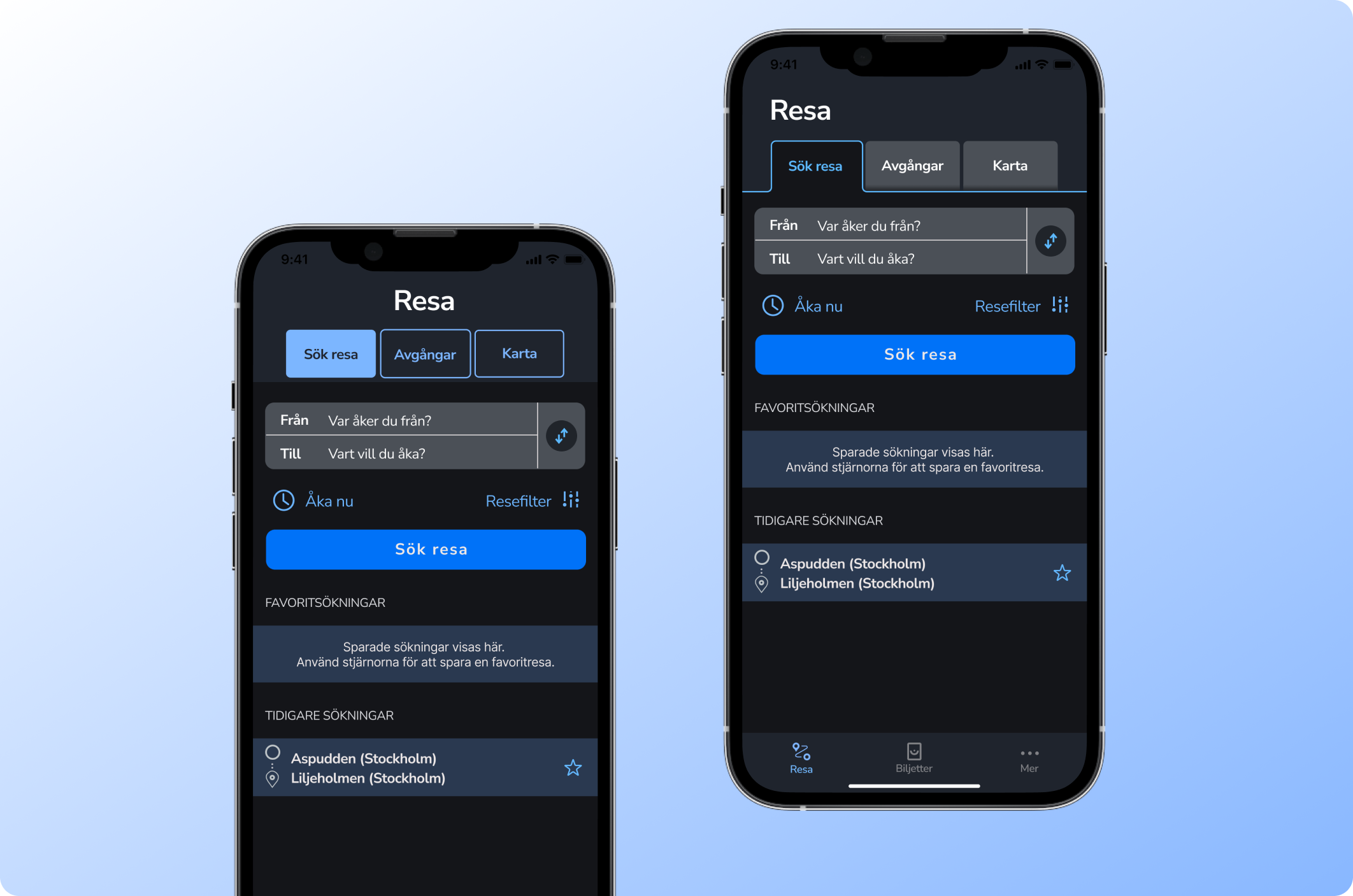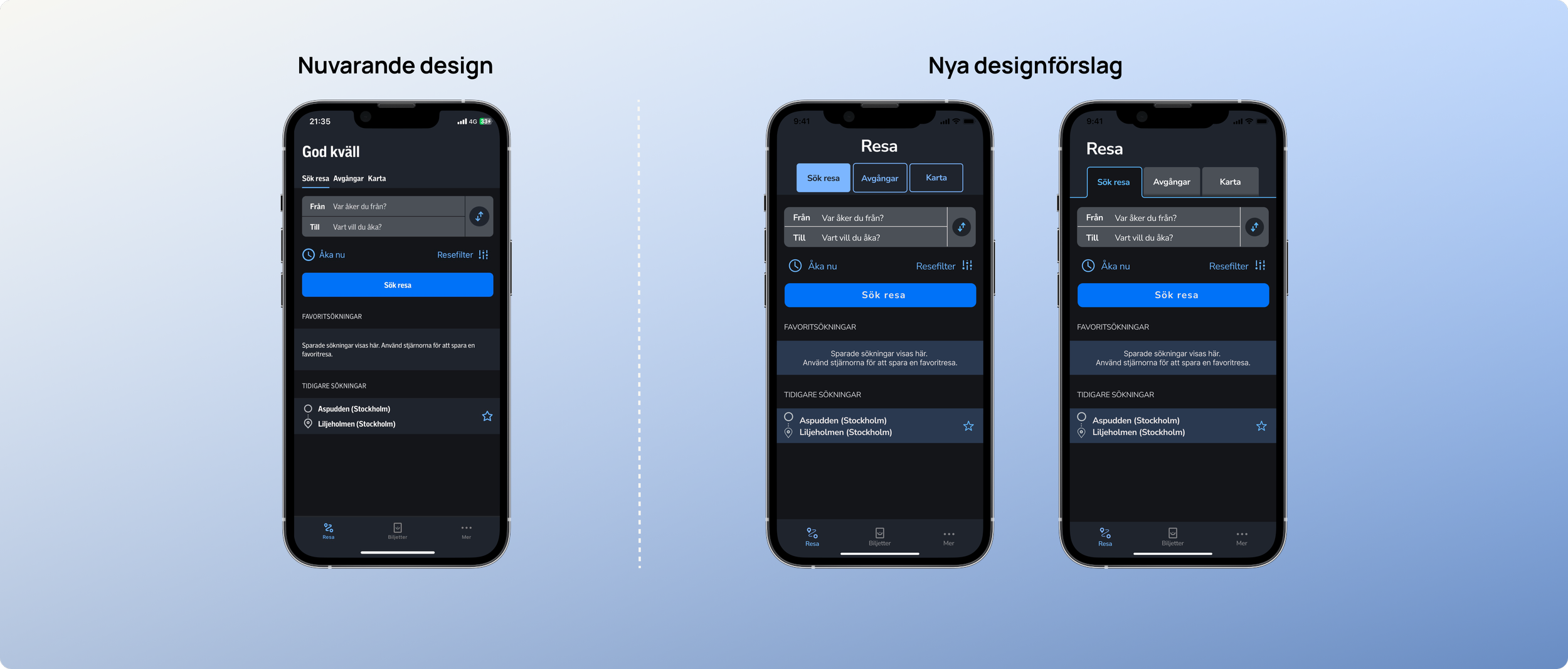 Problem: Visuellt otydligt att du som användare är inne på en av tre undersidor; sök resa, avgångar, och karta då du har uppe “Resa”-sidan i appen.