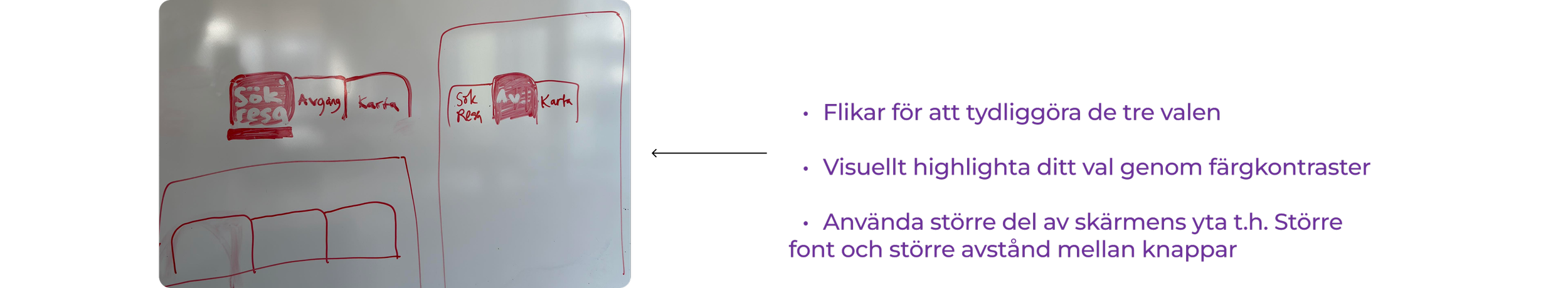 Vi prioriterade att börja göra wireframes på designförslag för att synliggöra sektionerna för “Sök resa, Avgångar och Kartor”, med fokus på kvantitet före kvalitet.